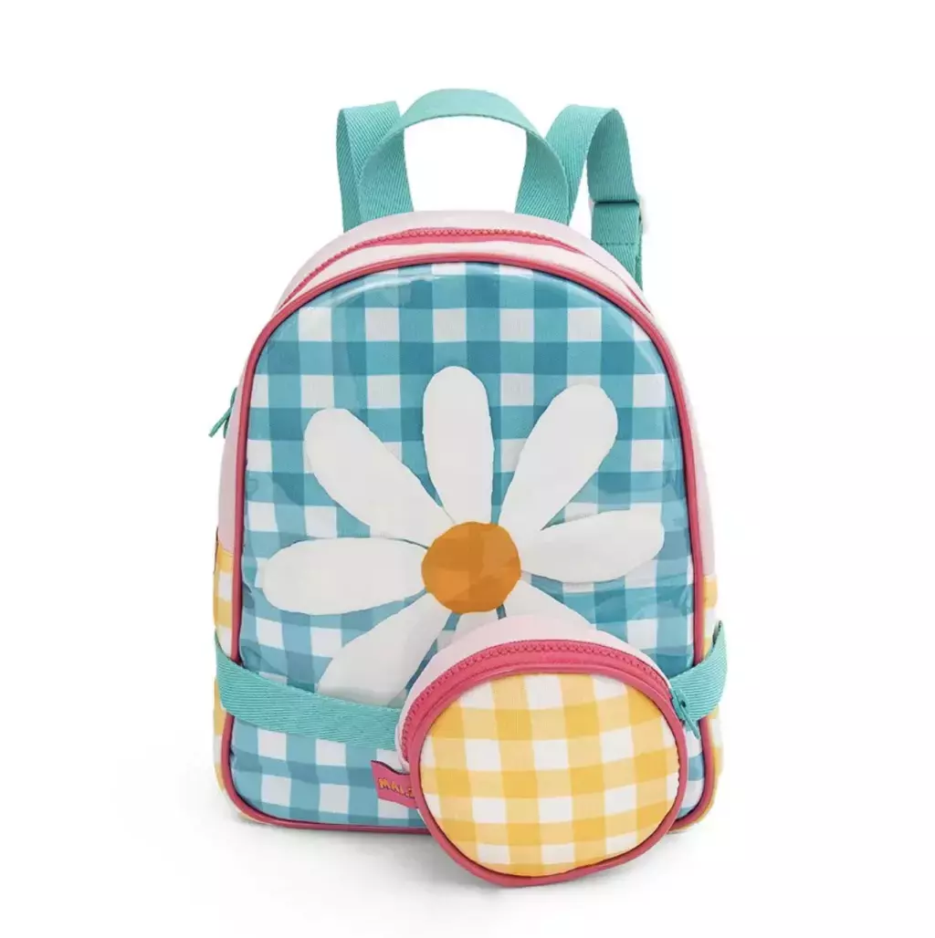 Uma peça delicada e prática, com estampa xadrez azul e margaridas brancas, perfeita para meninas cheias de charme. Conta com alças ajustáveis, zíper duplo e uma pochete acoplada que pode ser usada separadamente. Leve, resistente e encantadora para passeios, viagens e até a escola.